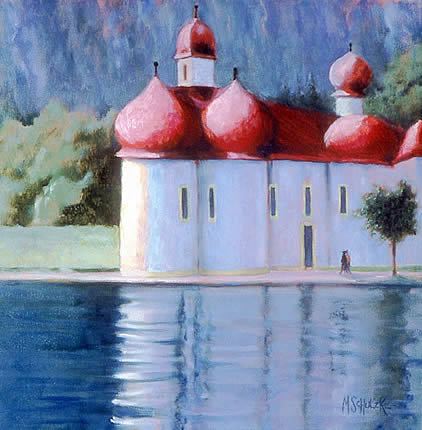 Across Konigsee ("The King's Lake"), nestled against the foot of the mighty Watzman, is Russian-styled St. Bartholomew's Church, built by the Archduke of Bavaria to console his homesick Russian bride. The artist traveled across Konigsee on an electric boat to obtain this view.
