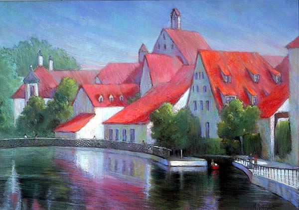 On the Isar Canal 18 x 23 pastel............The overlapping, intersecting angles of the red roofs of Landshut, in southeast Bavaria, captured the artist's eye and imagination. ..................