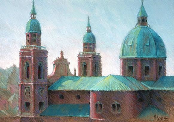 Salzburg IV 20 x 30 pastel ............ The distinctive, undulating eye-level view of the rooflines of Salzburg provided the inspiration for this painting. As viewed by the artist from narrow streets mounting to the Bishop's Castle. ..................