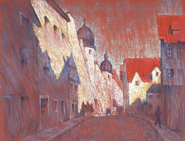 Bavarian Interlude24 x 19 pastel............Late afternoon light on a Bavarian city inspires the artist to experiment with color on a red archival surface, using the lightest touch possible. ..................