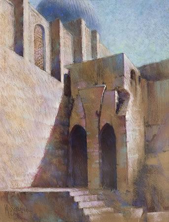 Jerusalem III 16 x 21 pastel............Prior to the 1967 War, this view of the Temple Mount was as close as Jews could get to the Wailing Wall. The implications are still moving to the artist. ..................