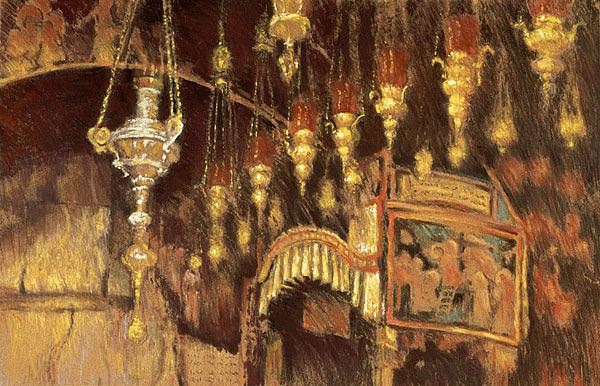 The Greek Orthodox section of Holy Sepulchre Church in Jerusalem is a visual feast. As you descend into the oldest portions of the Church, you are receding in time to the Fourth Century A.D.