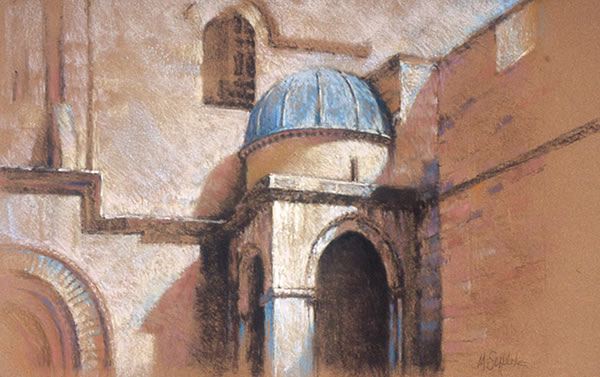 Jerusalem, Jerusalem19 x 14 pastel............Historic Holy Sepulchre Church, first constructed in the fourth century AD, when Helen, the mother of Constantine, visited Jerusalem. ..................