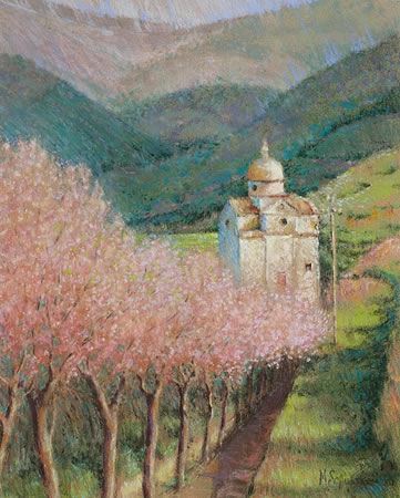 Tuscan Spring13 x 16 pastel............Early morning lights a church in the valley near an Italian hill town. The sense of history in such places both dwarfs and expands the imagination. ..................