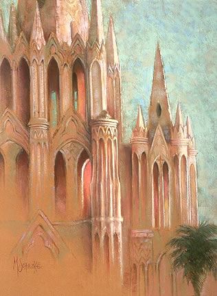 This mystical, rose sandstone church seemed to me to float in air, and that is how I have interpreted it. It graces the center of San Miguel de Allende, Mexico.