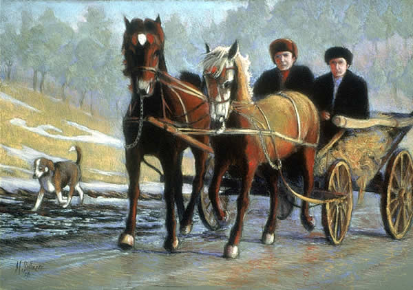 Moldovan Byways 23 x 35 pastel ..................Winter 1992: Many horse drawn carts frequent the road from Bucharest, Romania to its eastern border and on into Moldova.