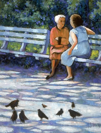 Soliloquy in Central Park 18 x 14 oil .................. Universal truth: Two elderly women gossiping, in New York's Central Park.