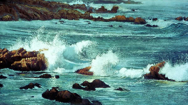 Asilomar Morning21 x 30 pastelCollection Sutter-Auburn Faith HospitalAuburn, CA..............Standing far out on the rocks at Asilomar, you see waves rolling toward the beach in the morning sun. ..................