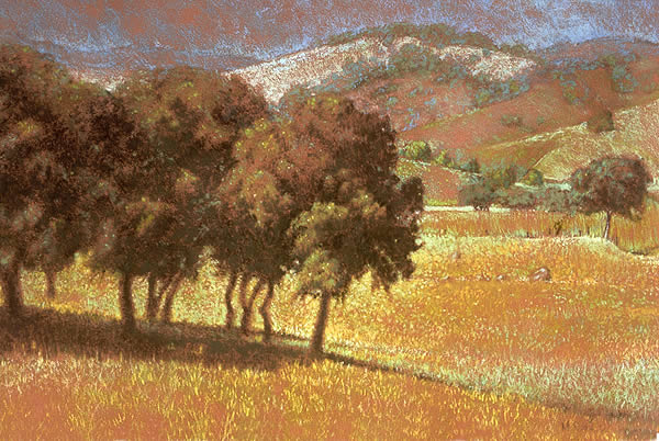Newcastle Summer24 x 16 pastel............The luxuriant foothills of the Sierras, just below Newcastle. Executed on a red surface, simplicity of means was the object in this painting. ..................